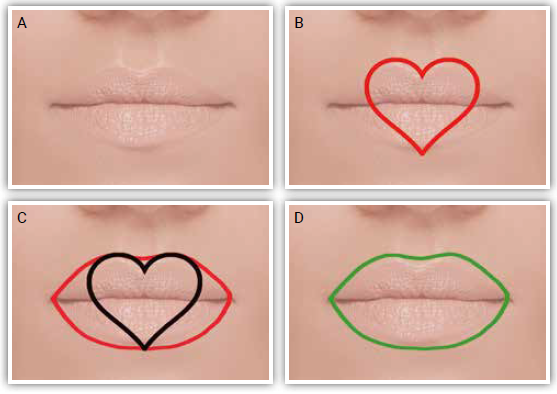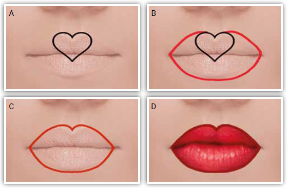 Infine, disegnate il centro seguendo proprio la forma del cuore che avete immaginato; applicate il rossetto e avrete una bocca con un perfetto e sensuale arco di Cupido (Figura 2 A-D).
